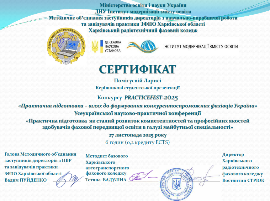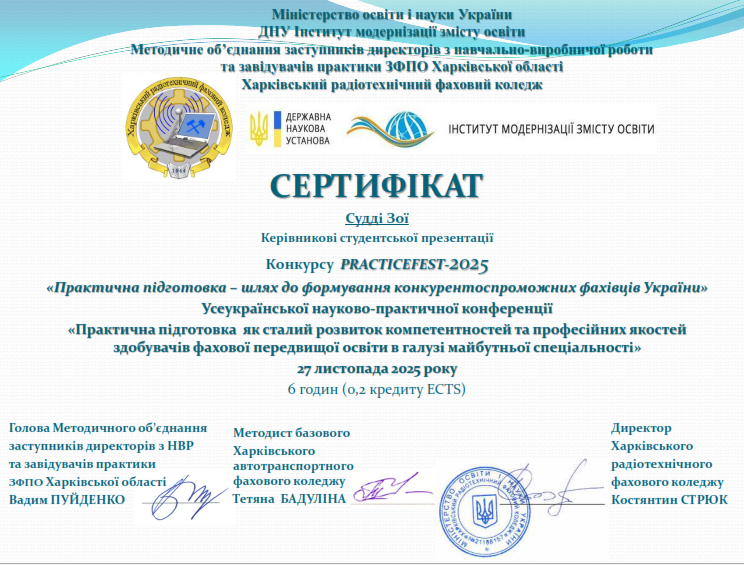 27 листопада 2025 року відбулась Всеукраїнська науково-практична конференція «Практична підготовка як сталий розвиток компетентностей та професійних якостей здобувачів фахової передвищої освіти в галузі майбутньої спеціальності», організована ДНУ «Інститут модернізації змісту освіти».