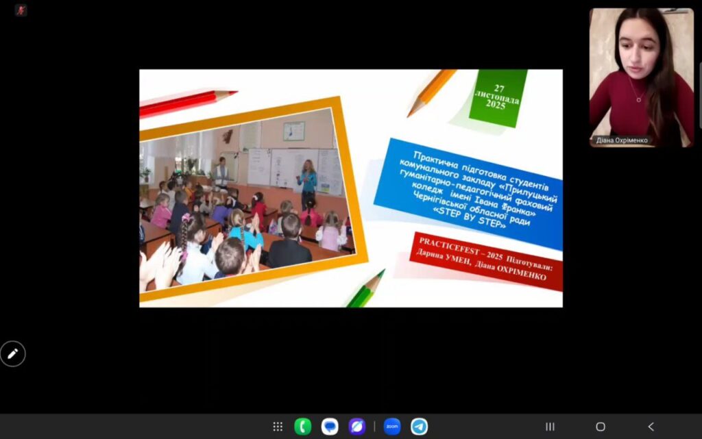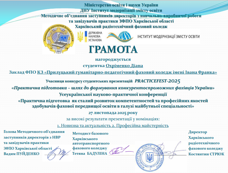 Студенти 4 курсу ОПП Початкова освіта брали участь у конкурсі студентських презентацій «PRACTICEFEST – 2025: «Практична підготовка – шлях до формування конкурентоспроможних фахівців України» під керівництвом завідувачки навчально-виробничої практики коледжу Зої СУДДІ та викладача іноземних мов Лариси ПОМІГУЄВОЇ, який був організований Харківським радіотехнічним фаховим коледжем у рамках конференції. Дарина УМЕН та Діана ОХРІМЕНКО отримали грамоти за високі результати презентації «STEP BY STEP» у номінаціях «Новизна та актуальність», «Професійна майстерність». Вітаємо учасниць конкурсу!