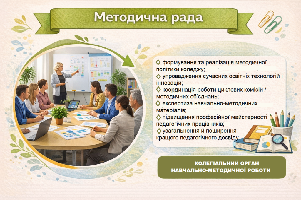 Методична рада — колегіальний орган коледжу, що забезпечує науково-методичний супровід освітнього процесу та підвищення якості навчання.