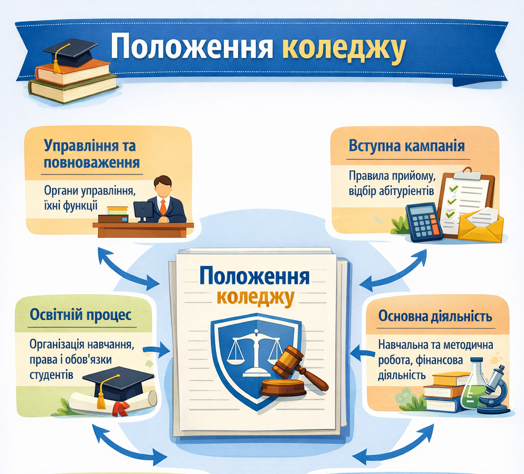 Положення коледжу — це сукупність основних внутрішніх нормативних документів, що регламентують діяльність закладу освіти відповідно до чинного законодавства України. Вони визначають організаційні, управлінські, освітні, методичні та соціальні аспекти функціонування коледжу, а також права й обов’язки учасників освітнього процесу.