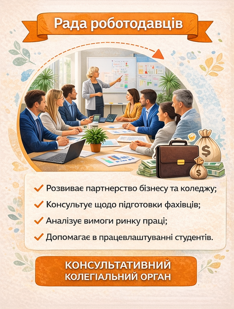 Рада роботодавців — колегіальний консультативно-дорадчий орган закладу фахової передвищої освіти, що забезпечує взаємодію коледжу з роботодавцями та сприяє узгодженню освітнього процесу з потребами ринку праці.
